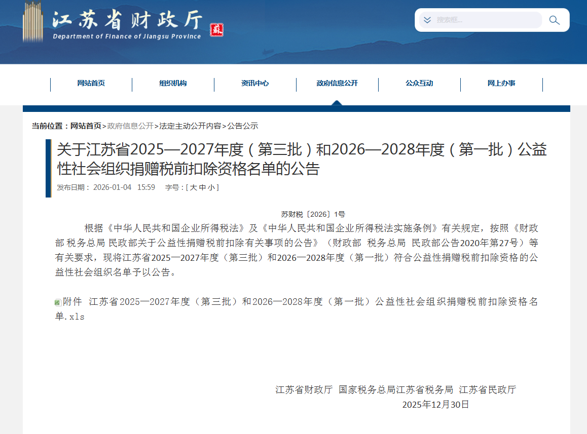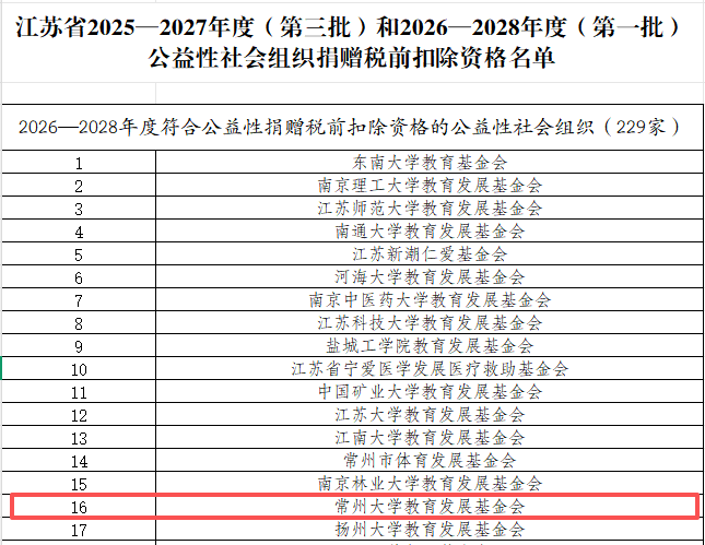 近日,根据江苏省财政厅、国家税务总局江苏省税务局、江苏省民政厅联合印发的《关于江苏省2025—2027年度(第三批)和2026-2028年度(第一批)公益性社会组织捐赠税前扣除资格名单的公告》苏财税〔2026〕1号,常州大学教育发展基金会获得公益性社会组织捐赠税前扣除资格,有效期为三年(2026-2028年)。