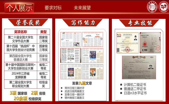 在创新创业领域,潘亦为同样锐意进取、勇毅争先。他主动参与高水平双创赛事,不仅斩获第十四届“挑战杯”全国大学生课外学术科技作品竞赛国家级铜奖、第十届中国国际“互联网+”大学生创新创业大赛省级银奖,还加入常州大学“南七之光”团队,参与中国国际大学生创新大赛国家级金奖项目《精益求精》,积累了扎实的赛事实战经验。同时,他深知当前就业形势的严峻性,在筹备毕业生校园招聘会期间,多方调研当下就业真实情况;并积极参与职业规划大赛,连续两届跻身省赛冲刺营,在职业规划的道路上行稳致远。